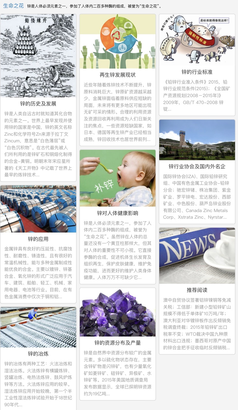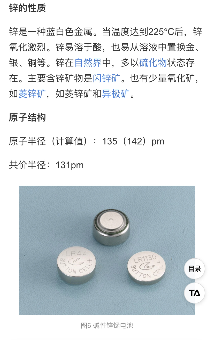 此外,锌具有良好的抗电磁场性能。锌的导电率是标准电工铜的29%,锌板是一种非常有效的屏蔽材料,同时由于锌是非磁性的,适合做仪器仪表零件的材料及仪表壳体及钱币,同时,锌自身及与其他金属碰撞不会发生火花,适合作井下防爆器材。广泛用于橡胶 、涂料、搪瓷、医药、印刷、纤维等工业。锌具有适宜的化学性能。锌可与NH4CI发生作用,放出H+正离子。锌-二氧化锰电池正是利用锌的这个特点,用锌合金做电池的外壳,既是电池电解质的容器,又参加电池反应构成电池的阳极。它的这一性能也被广泛地应用于医药行业。锌与酸或强碱都能发生反应,放出氢气。锌肥(硫酸锌、氯化锌)有促进植物细胞呼吸、碳水化合物的代谢等作用。锌粉、锌钡白、锌铬黄可作颜料。氧化锌还可用于医药、橡胶、油漆等工业。