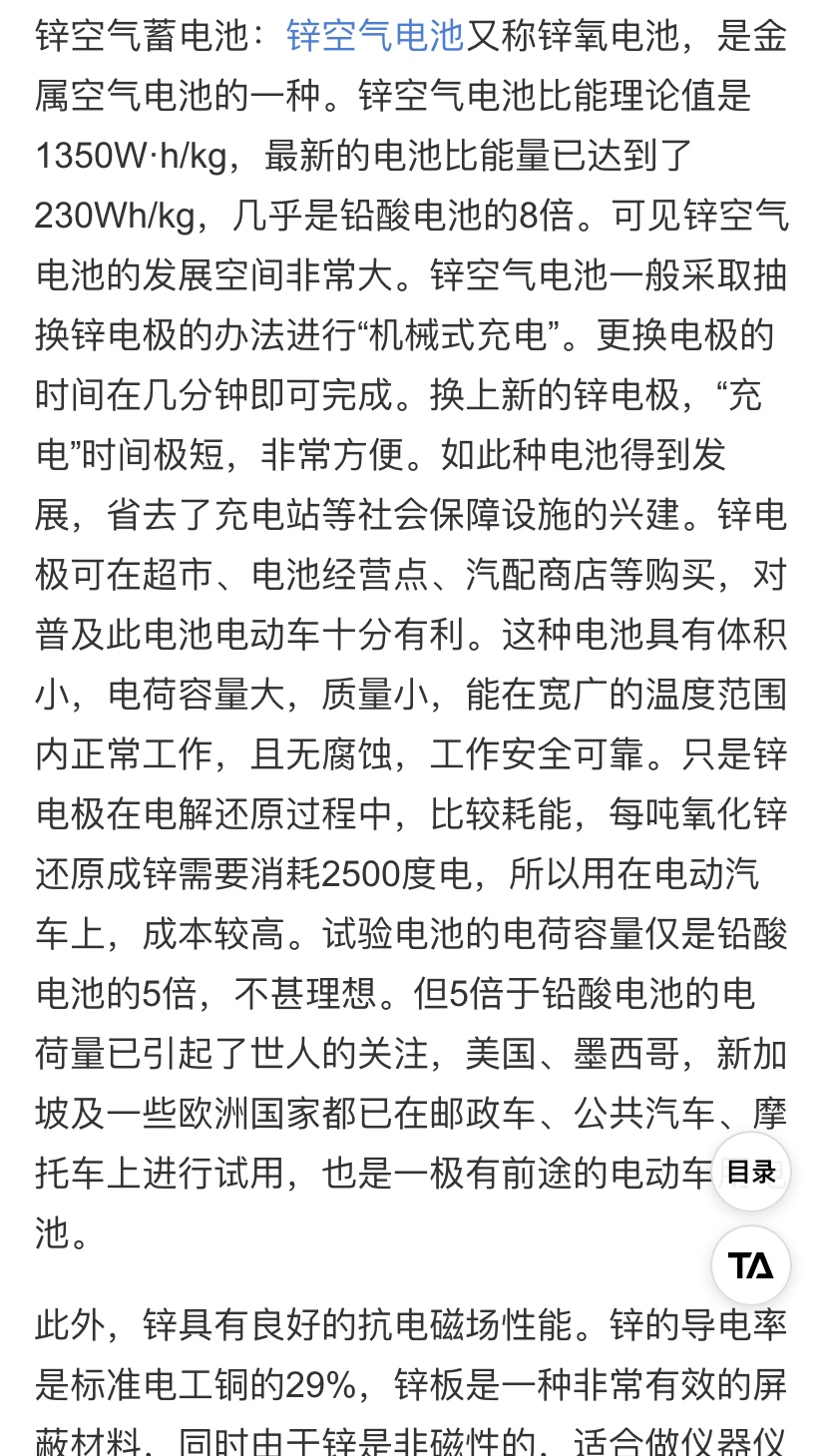 锌空气蓄电池:锌空气电池又称锌氧电池,是金属空气电池的一种。锌空气电池比能理论值是1350Wh/kg,最新的电池比能量已达到了230Wh/kg,几乎是铅酸电池的8倍。可见锌空气电池的发展空间非常大。锌空气电池一般采取抽换锌电极的办法进行“机械式充电”。更换电极的时间在几分钟即可完成。换上新的锌电极,“充电”时间极短,非常方便。如此种电池得到发展,省去了充电站等社会保障设施的兴建。锌电极可在超市、电池经营点、汽配商店等购买,对普及此电池电动车十分有利。这种电池具有体积小,电荷容量大,质量小,能在宽广的温度范围内正常工作,且无腐蚀,工作安全可靠。只是锌电极在电解还原过程中,比较耗能,每吨氧化锌还原成锌需要消耗2500度电,所以用在电动汽车上,成本较高。试验电池的电荷容量仅是铅酸电池的5倍,不甚理想。但5倍于铅酸电池的电荷量已引起了世人的关注,美国、墨西哥,新加坡及一些欧洲国家都已在邮政车、公共汽车、摩托车上进行试用,也是一极有前途的电动车用电池。